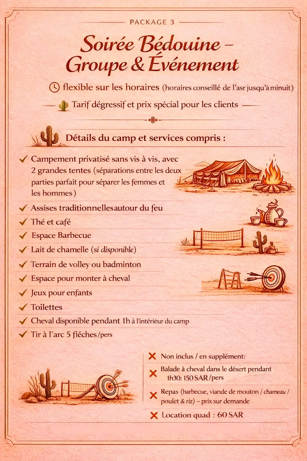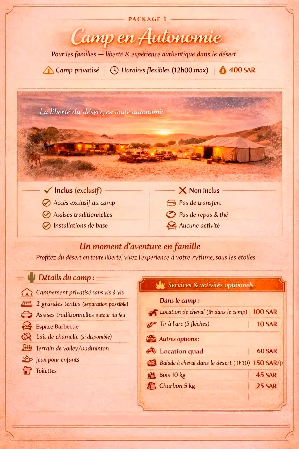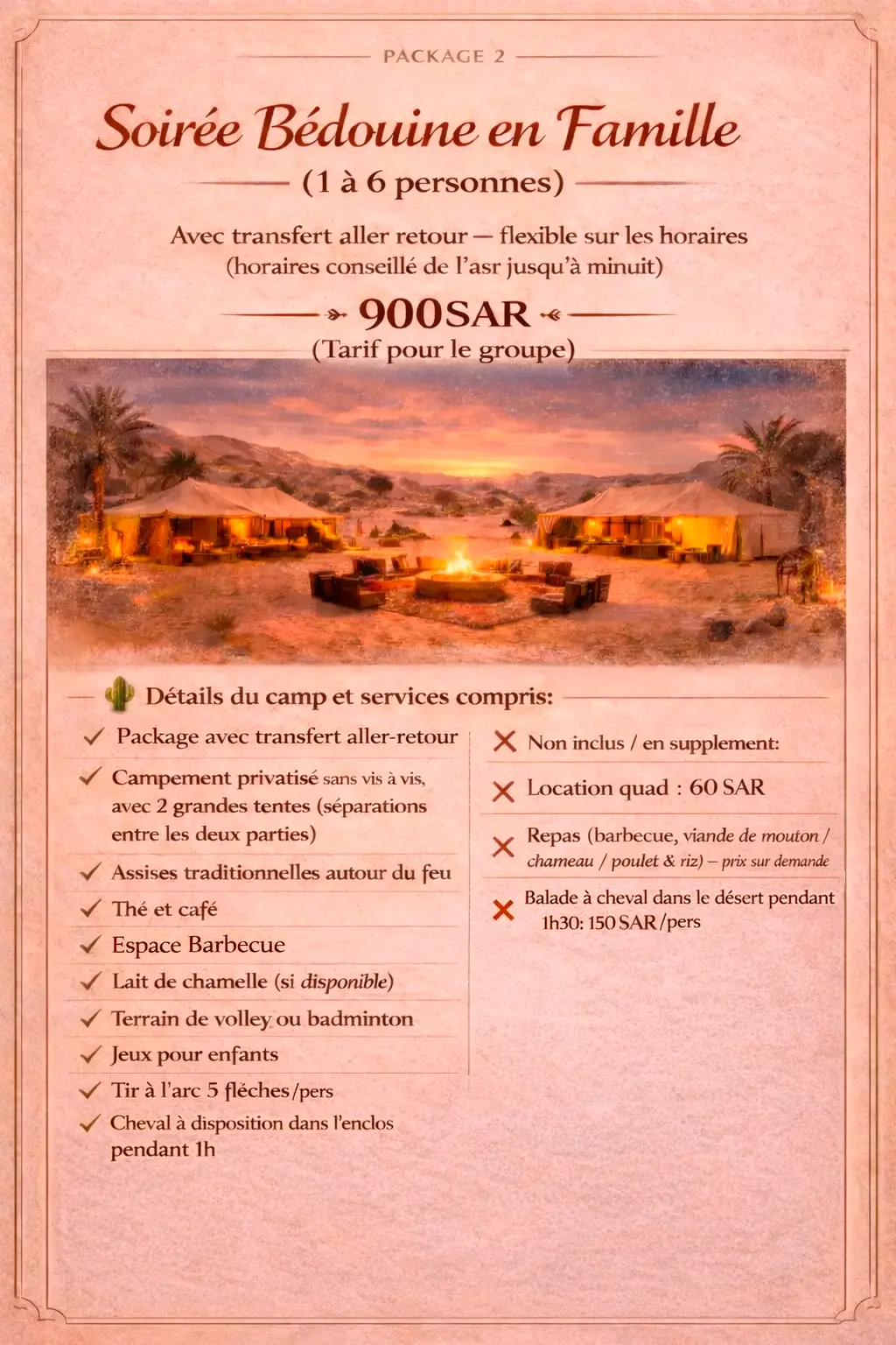Nous avons vécu une expérience incroyable dans ce camp bédouin. L’accueil était chaleureux, authentique et profondément humain. Nous avons appris énormément, non seulement sur la vie dans le désert, mais aussi sur l’histoire et les traditions de l’Arabie saoudite. C’était une vraie immersion culturelle. Et le lait de chamelle était délicieux ! Je recommande vivement cette expérience.