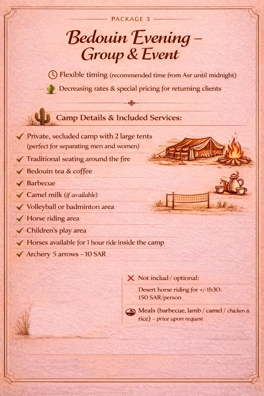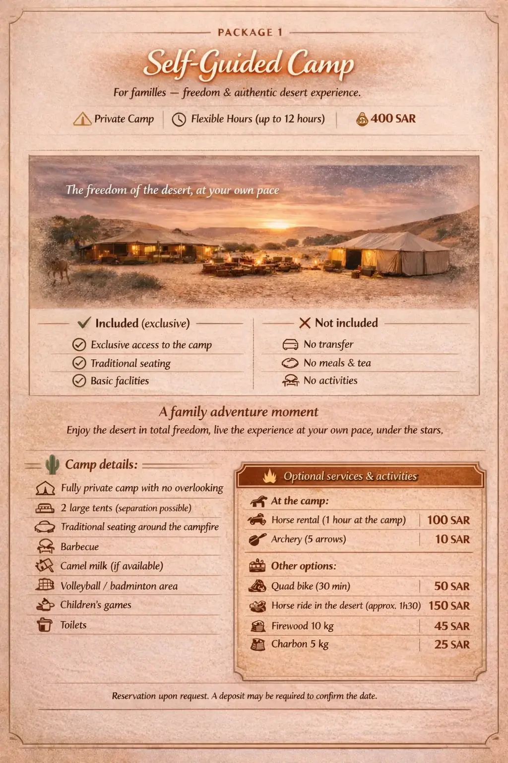 I wanted to take a moment to share my feedback following the wonderful evening we spent at your camp 🏕️. Everything was perfect, alhamdulillah: your husband’s arrival right on time, the space in his vehicle, his clear explanations, his warm welcome, and his tea 🥰. We had an amazing time, and the children absolutely loved it — the animals, the camel milk, the games… Alhamdulillah, it is a life moment that will undoubtedly stay with them forever. JazakAllahu khayran for being the reason behind this 🤲🏽🤲🏽.
